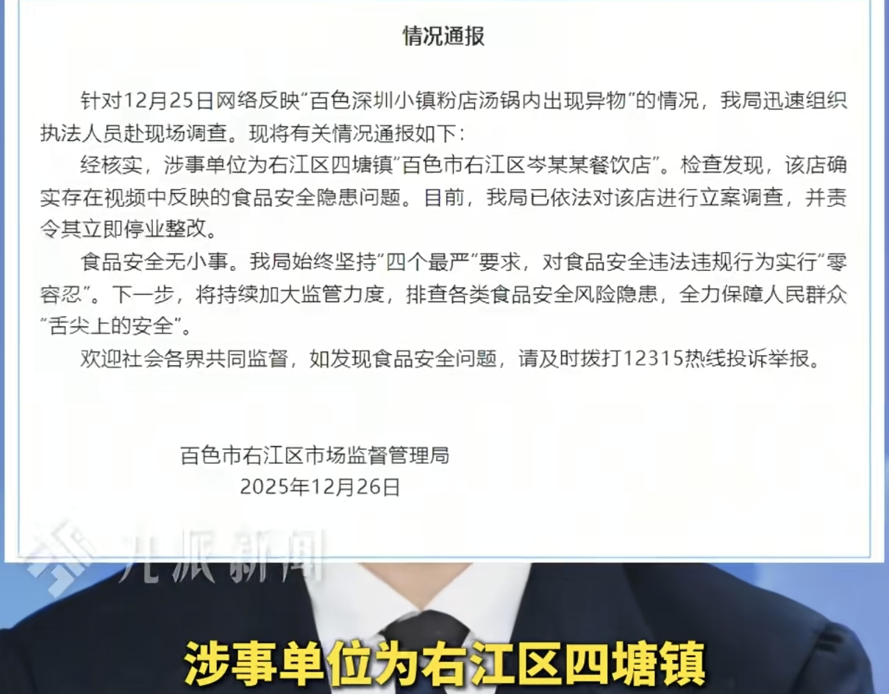 事件发酵后,监管部门的动作十分迅速,12月26日,百色市市场监督管理局工作人员回应,已经主动监测到相关视频,第一时间找到涉事店家进行实地核实,经过初步调查,视频中反映的情况属实,当即对涉事店铺进行立案调查。
