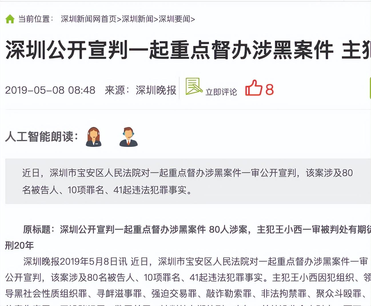 “深圳公开宣判一起重点督办涉黑案件主犯王小西一审被判20年”深圳晚报2019.05.08