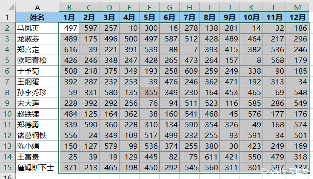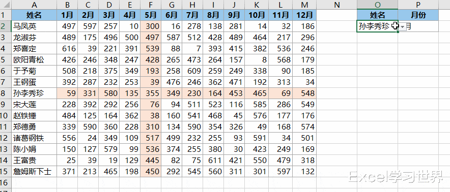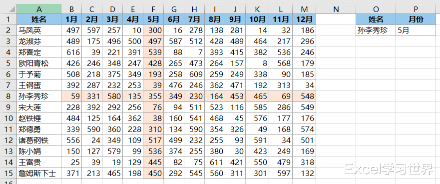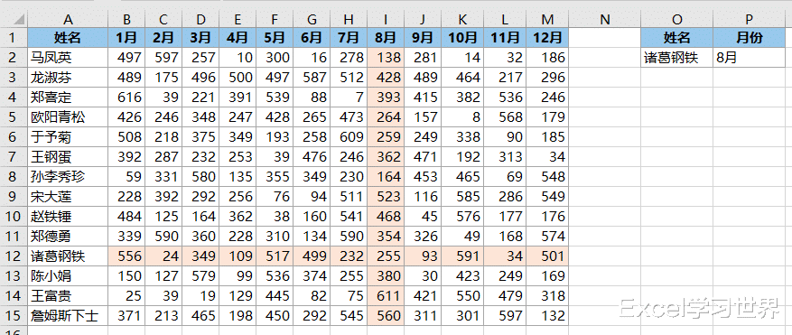 给下图 1 的数据表制作行列查询的下拉菜单,查询结果所在数值区域的整个十字区域都自动高亮显示。