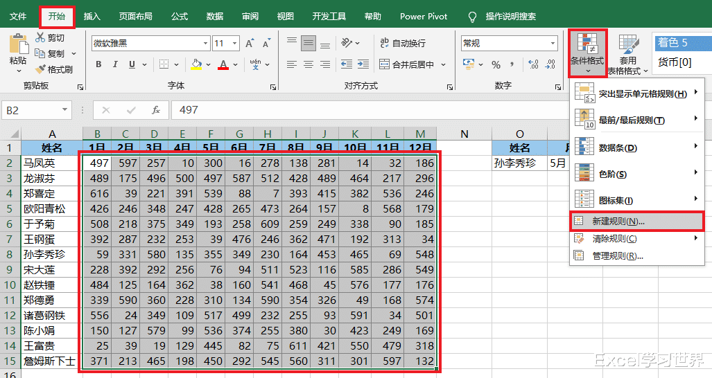 2. 选中数值区域 --> 选择任务栏的“开始”-->“条件格式”-->“新建规则”