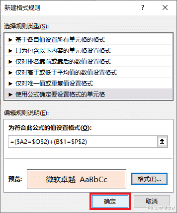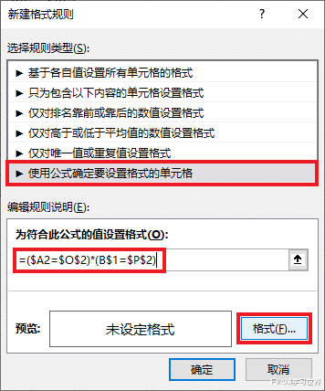 3. 在弹出的对话框中选择“使用公式确定要设置格式的单元格”--> 输入以下公式 --> 点击“格式”按钮: