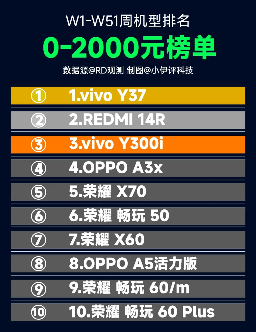 这个榜单中清一色的都是国产机了,排名前三的都是大家不那么熟的手机vivo Y37、红米14R、vivo Y300i。