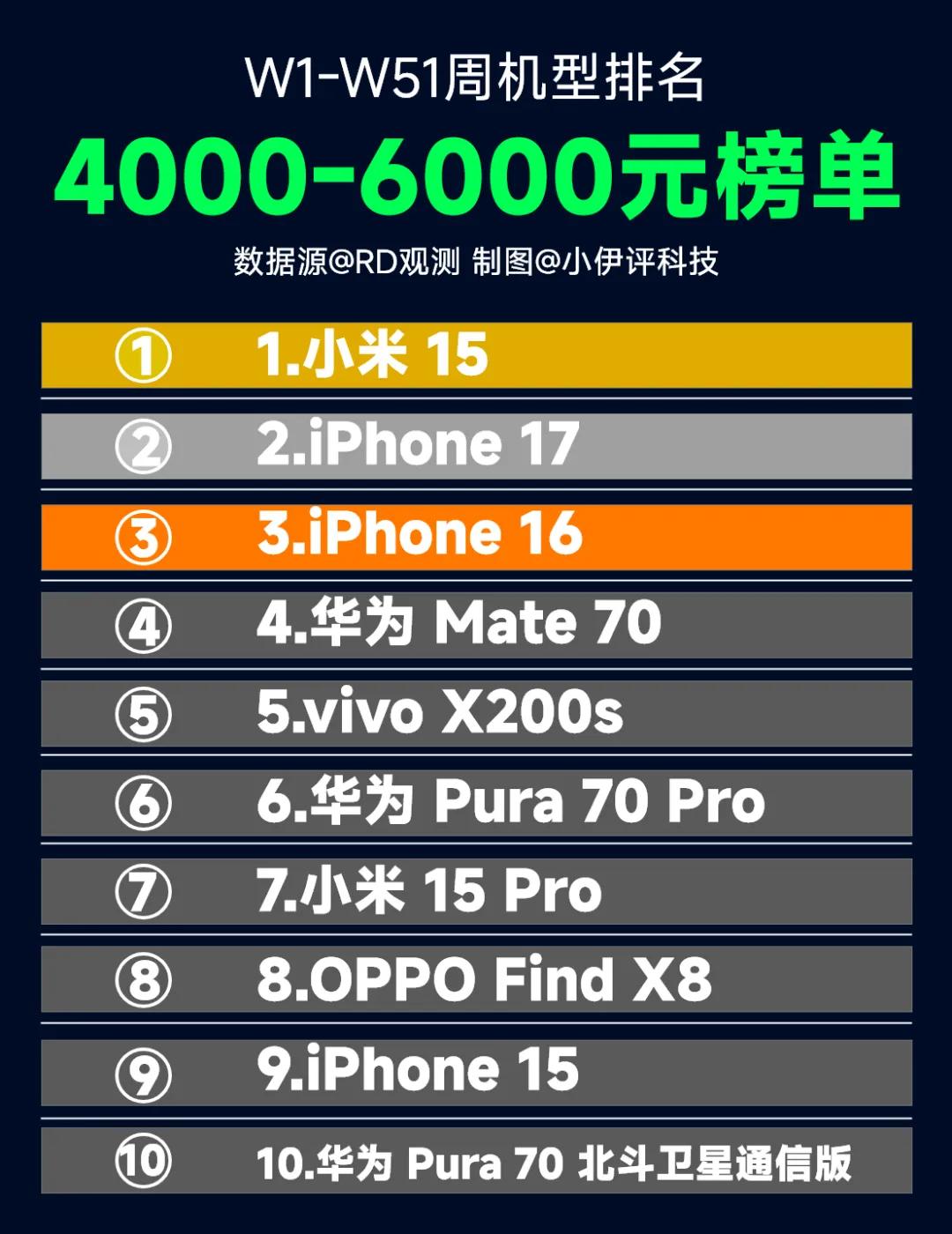 这个榜单中,就是大家都非常熟悉的产品了,我没想到的是,排在第一位的竟然能是小米15...,竟然能比iPhone16/17卖得好,这是我没想到的。