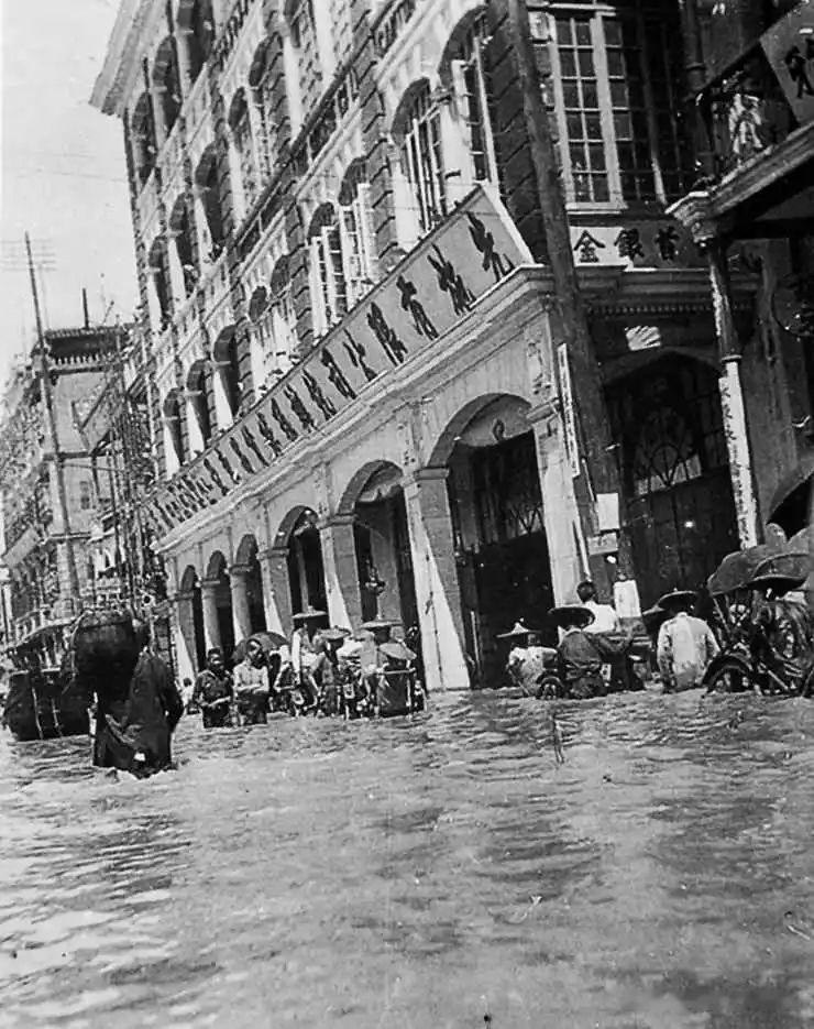 这是1915年广州长堤水浸的惨痛现场照,原本繁华的商业区已沦为泽国,浑浊的洪水漫过长街,浸到骑楼的拱廊下,连建筑外墙上“先施”、“金銀業”的招牌,都衬着泡在水里的街面。