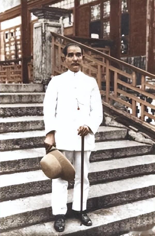 这张照片定格了1917年7月17日孙中山抵穗个人照,他身着一身素白的立领服饰,显得干练而庄重,一手握着深色手杖撑在石阶上,另一手轻托着礼帽,站姿沉稳地立在层级分明的石阶前,身后楼阁隐约透出广州当地的院落风貌,恰是他刚从上海南下、开启护法运动的第一帧留影。