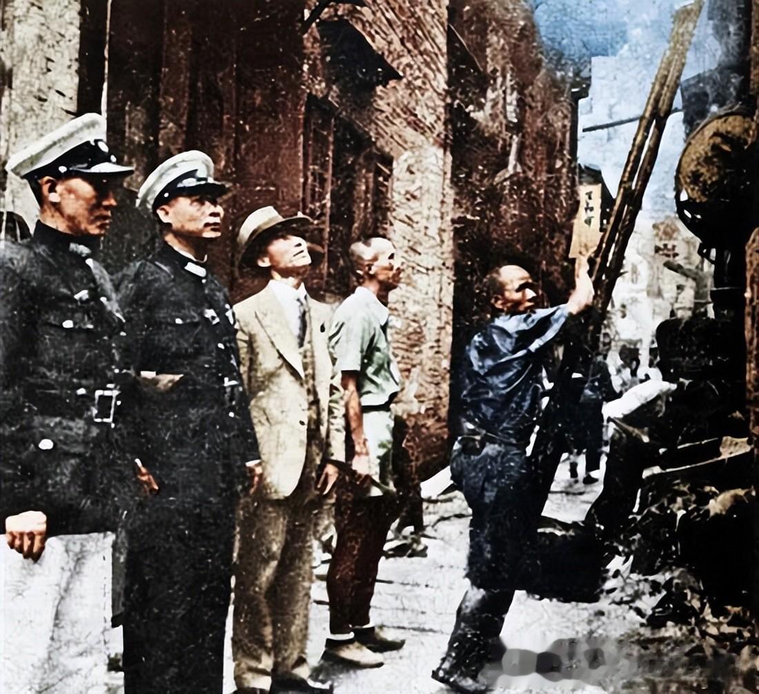这是1936年广州老巷里的市政清洁现场,前排立着两位穿深色警式制服的公职人员,旁边是套浅色西装的督责人员,几人的目光都落向右侧,一位短打装束的市民正举着长杆工具,仰头打理墙面,动作里透着认真。