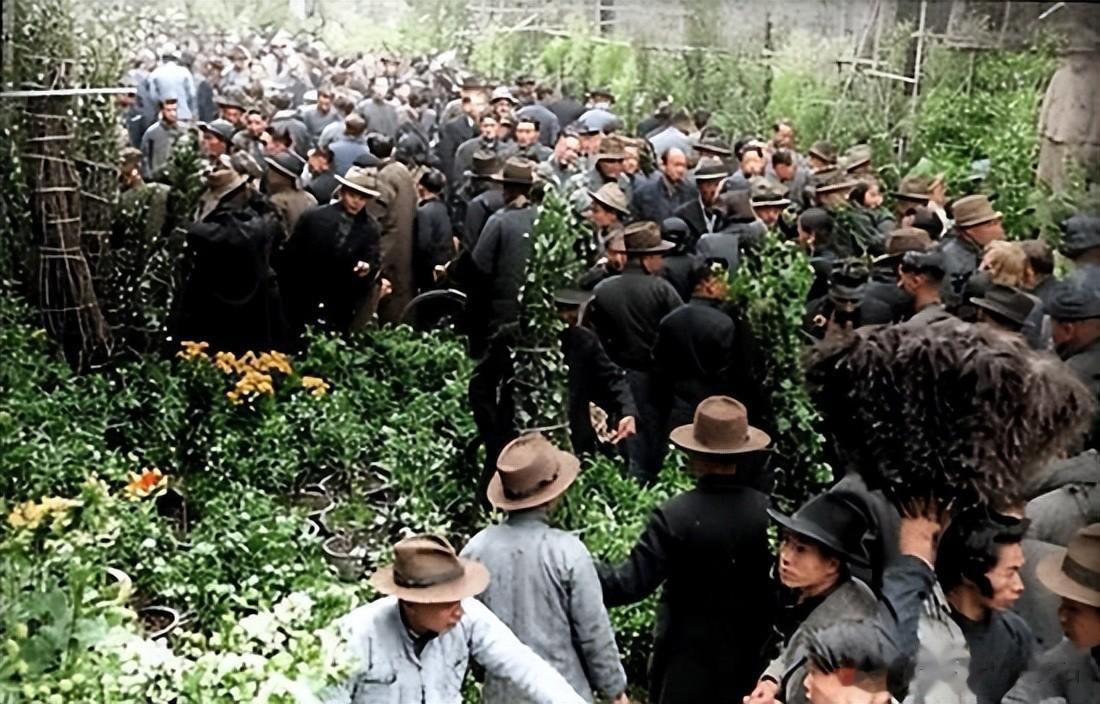 这是民国时期广州行花街,露天花田里攒着裹满市井热络的街坊,十有八九都扣着一顶挺括的礼帽,是那个年代广州男女都偏爱的装扮;有人穿长衫拢着袖子弯腰挑花,有人套短褂凑在花丛边跟花农搭话。