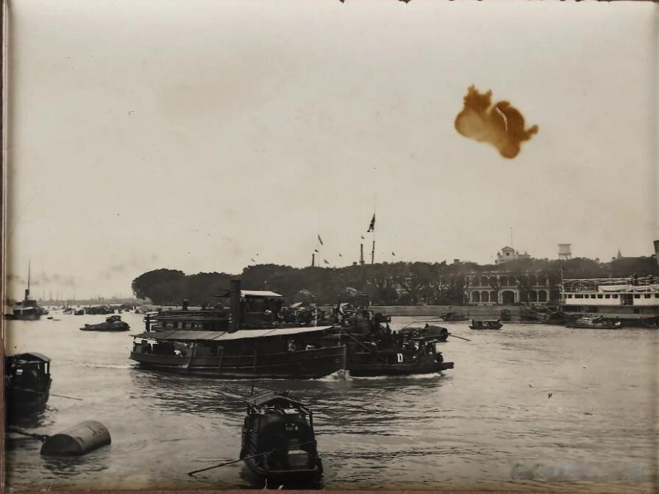船侧还漂着窄小的舢板,桨影轻划开涟漪,远处沙面岛的西式楼宇立在岸线后,屋顶飘着英、法、德等国的旗帜。