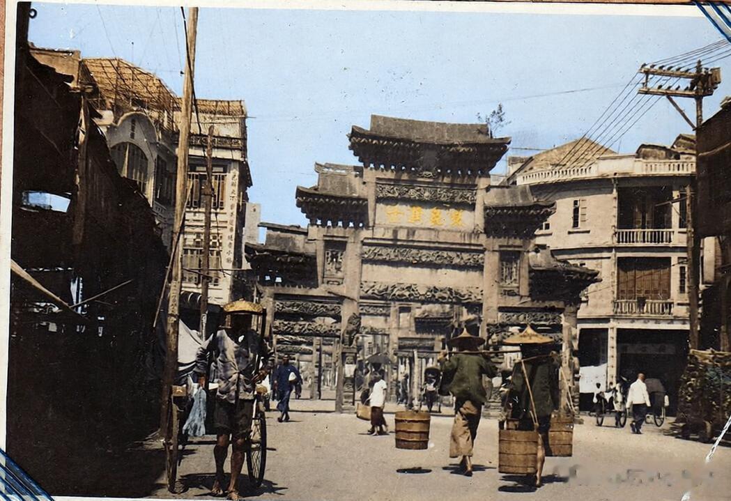 这是民国时期广州四牌楼一带的街景,画面中央立着雕饰繁复的传统石牌坊,多层翘檐裹着岭南古建的精巧。