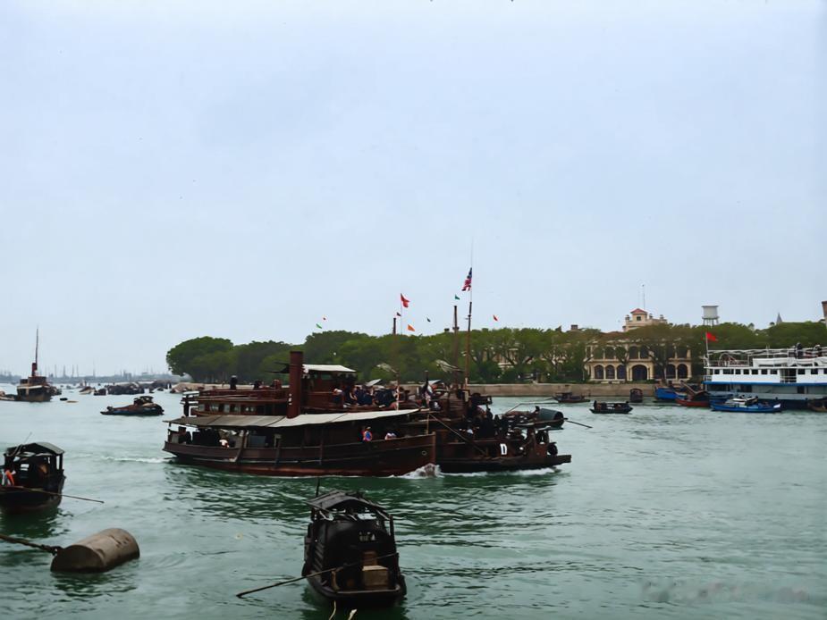 这张民国照片,是隔江望向沙面,珠江水面泛着细碎波纹,前景里的“小火轮”乘客们,挤得满满当当,这就是是当时的“水上巴士”,载着两岸街坊赶工、赴市的日常往来。那些挤在船中的身影,没有刻意的摆拍,只是寻常街坊的过江日常。
