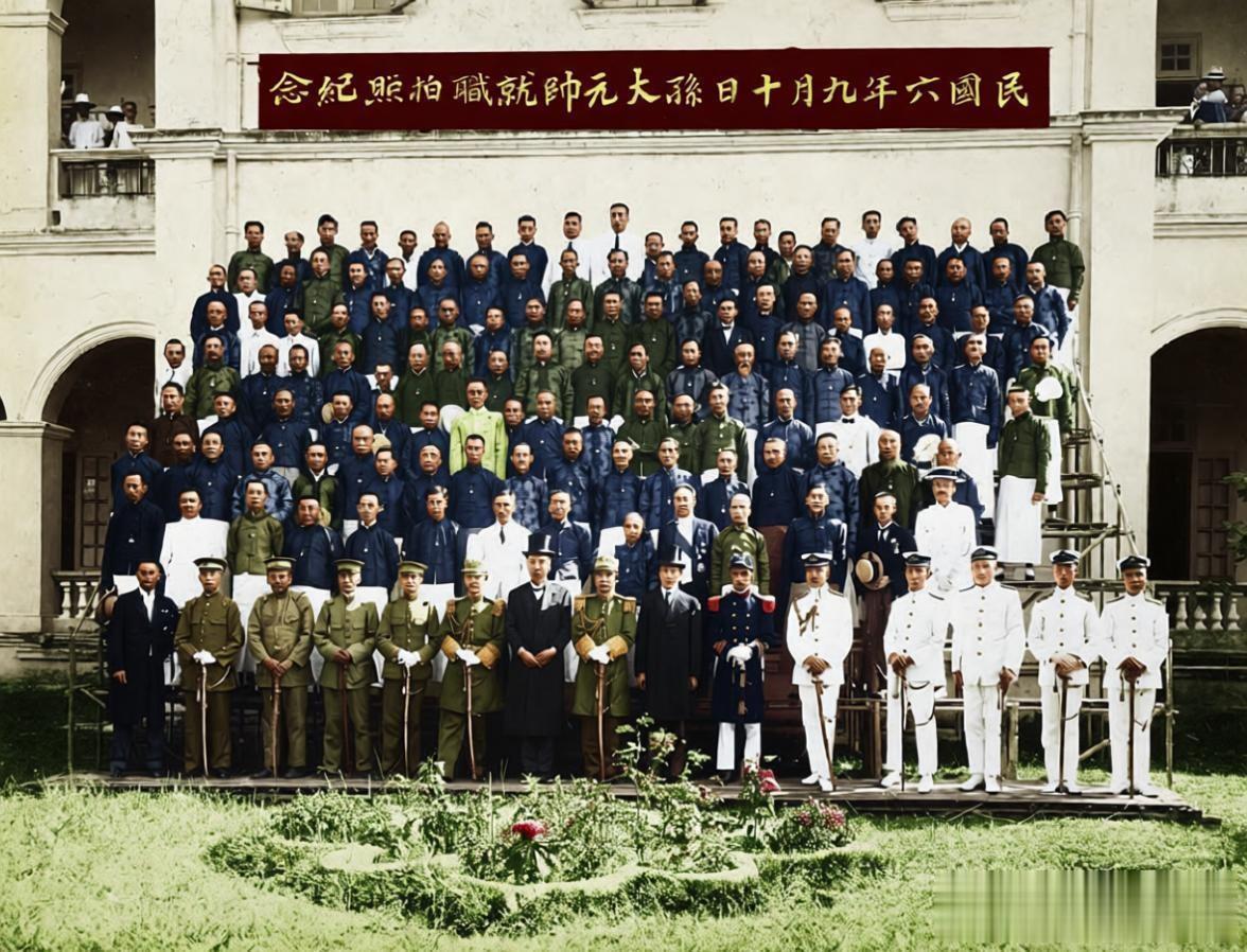 这是1917年9月10日,孙中山就任海陆军大元帅就职典礼的纪念合影,照片中的“民国六年九月十日孙大元帅就职摄影纪念”的字样清晰醒目,阳台处还站着观礼的人员,衬出典礼的庄重。