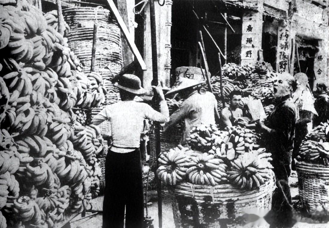 这是上世纪40年代广州水果批发市场,成垛的香蕉把粗竹筐堆得冒了尖,青黄的蕉串裹着岭南鲜果的鲜活气。