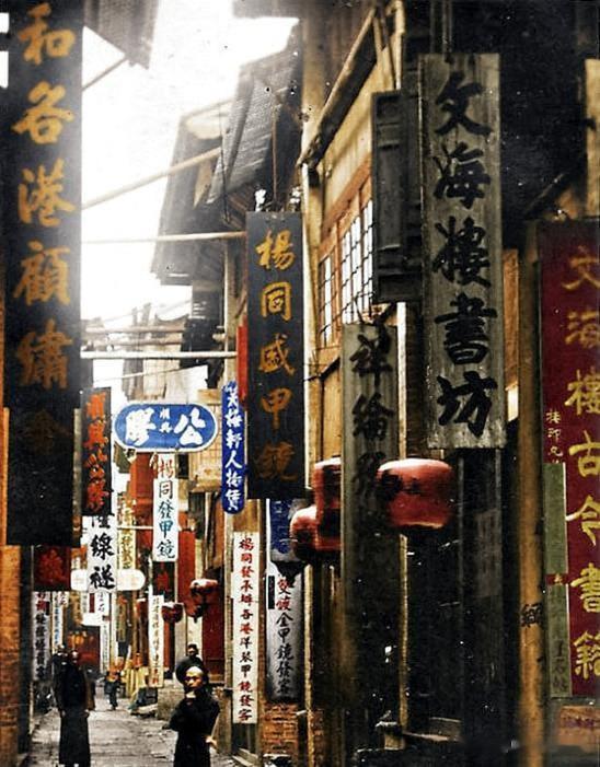 这张老照片,是民国时期广州双门底书坊街巷,窄窄的石板巷里,老墙面上支棱着一排竖写的墨色招牌,最醒目的“文海楼书坊”大字透着古雅,旁侧的小字“发兑古今”“拣选新刻”,正对应着书坊“刻、印、售”一体的老本行,不是后来只卖书的书店可比。