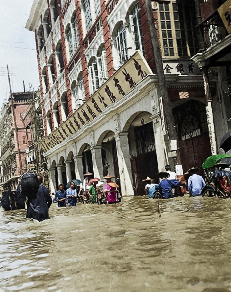 而这汪洪水,恰是三江水暴涨、海潮顶托的恶果,北江、西江洪流被逼滞留,广州三面受淹,画面里看似平缓的积水,实则最深达丈余,连骑楼的拱廊都成了“水廊”,把“繁华商区变泽国”。