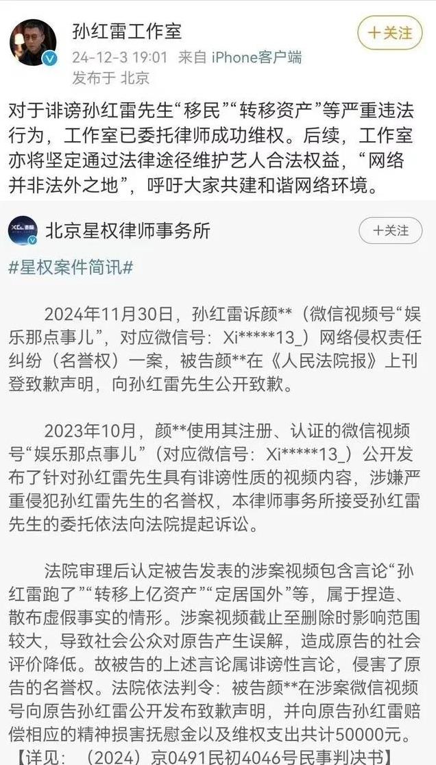 最后法院认定颜某某的行为构成诽谤,需要赔偿孙红雷5万元,让颜某某公开道歉,并在他的视频号主页置顶位置,发布致歉声明7天。
