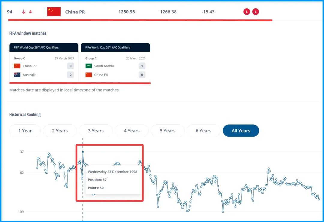 目前,中国男足从世界第90位跌至世界第94位,而中国男足在国际足联官方统计中的历史最高排名,是1998年的世界第37位。