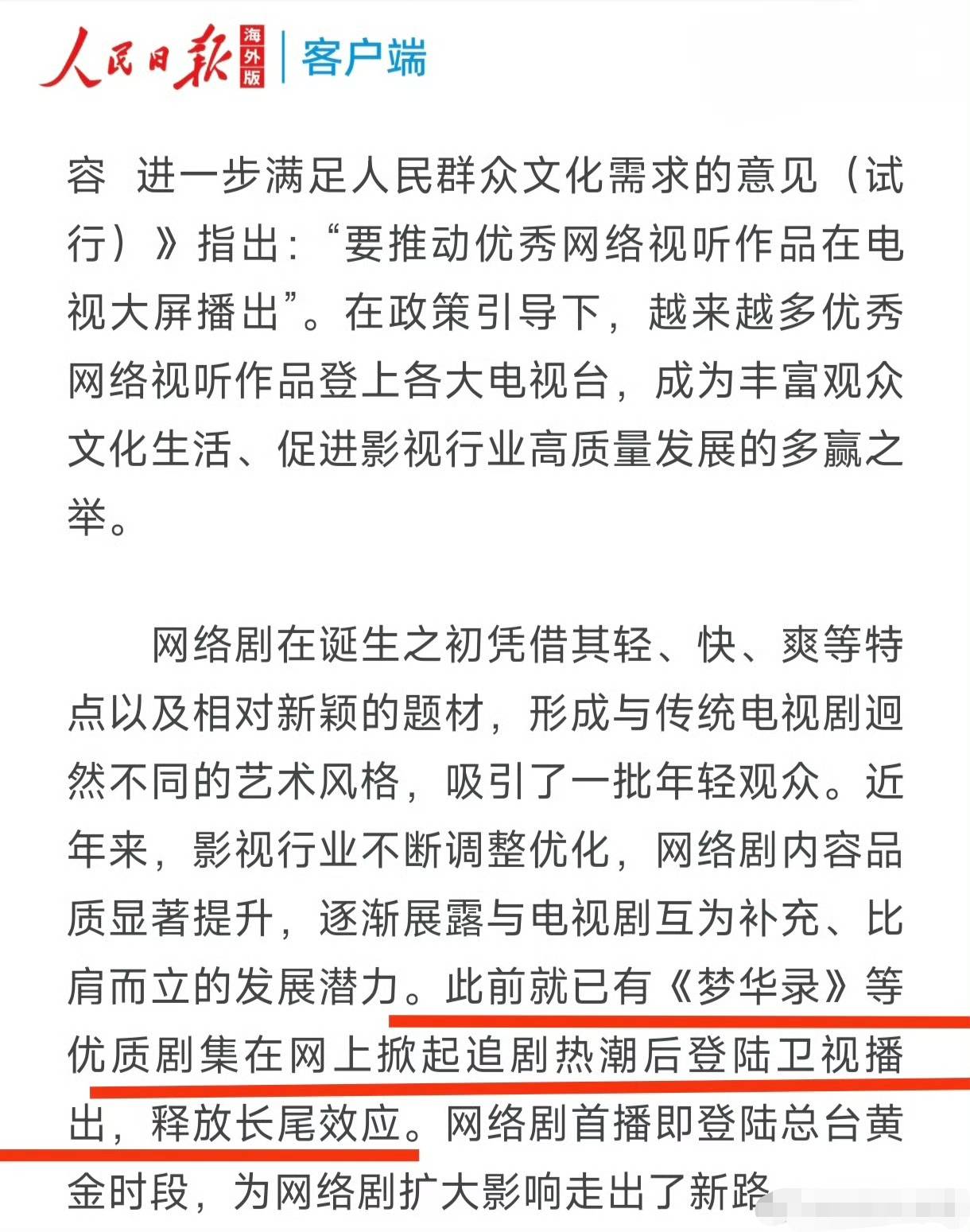 《人民日报》等官媒对刘亦菲的作品也是赞不绝口,其文艺评论“《让好内容进入好平台好时段》 评论特别提到——已有《梦华录》等优质剧集在网上掀起追剧热潮后登陆卫视播出,释放长尾效应。”