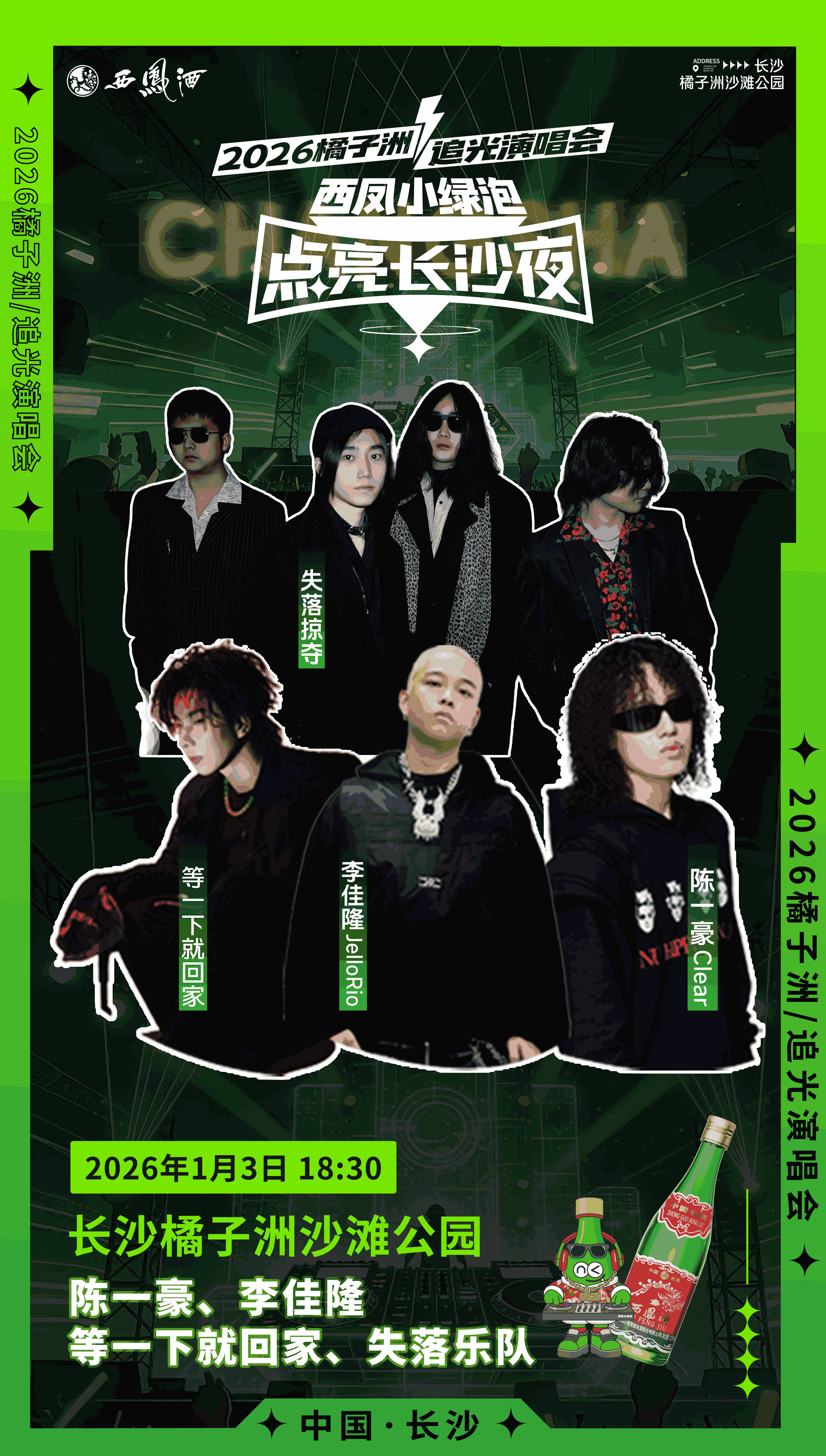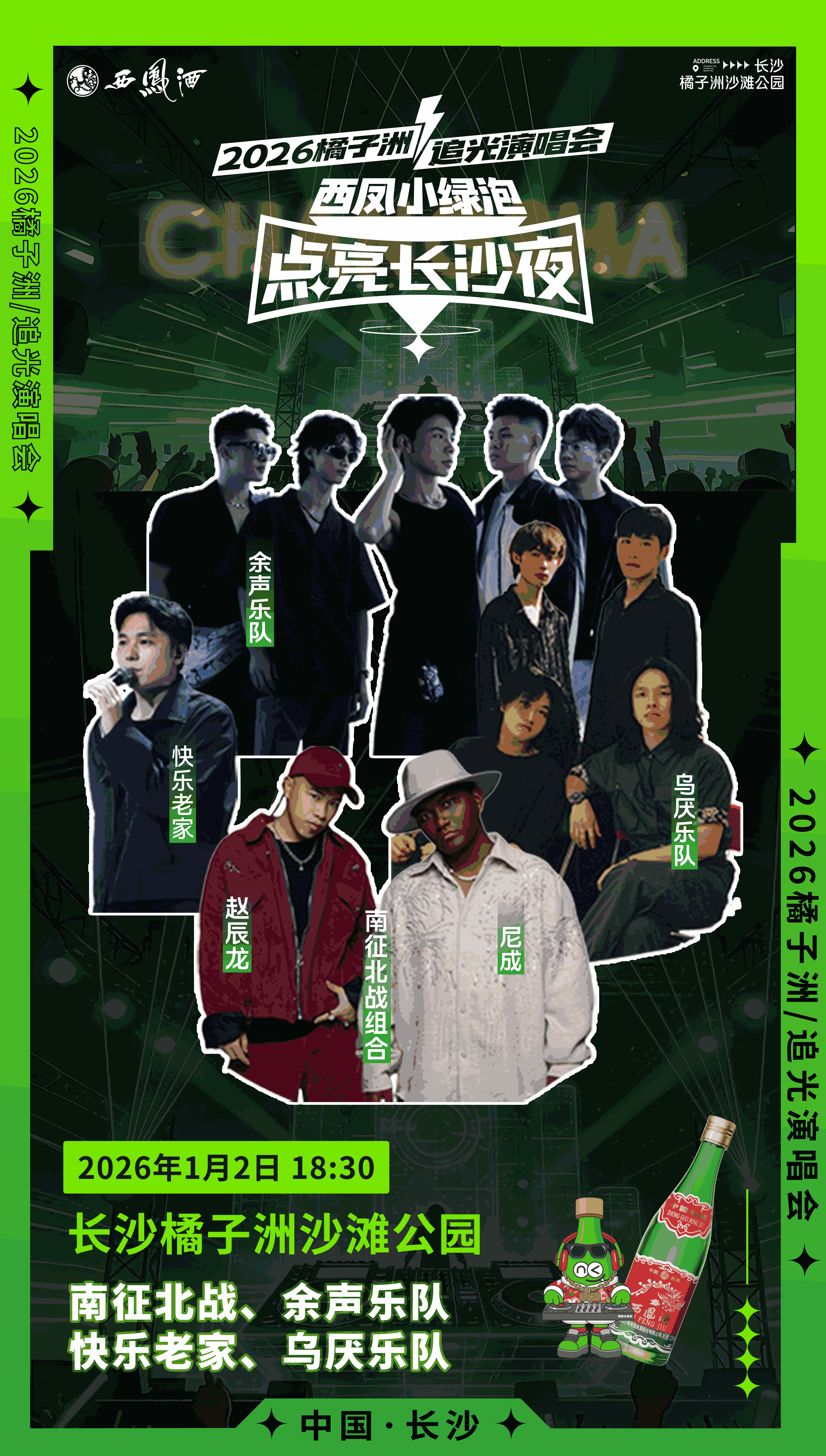 音乐节基本信息:日期:2026年1月2日-3日时间:13:00起主题互动开启,18:30准时开唱地点:橘子洲沙滩公园入场方式:凭西凤小绿泡瓶盖兑换门票,现场仍可兑换
