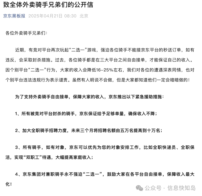 各位街坊邻居们注意了!最近外卖行业又闹出大动静,京东昨天突然发了一封火药味十足的公开信,把整个行业的内幕都掀了个底朝天。这事儿得从咱们每天见到的外卖小哥说起——您知道吗?这些风里来雨里去的骑手们,现在正被大平台逼着"站队"呢!