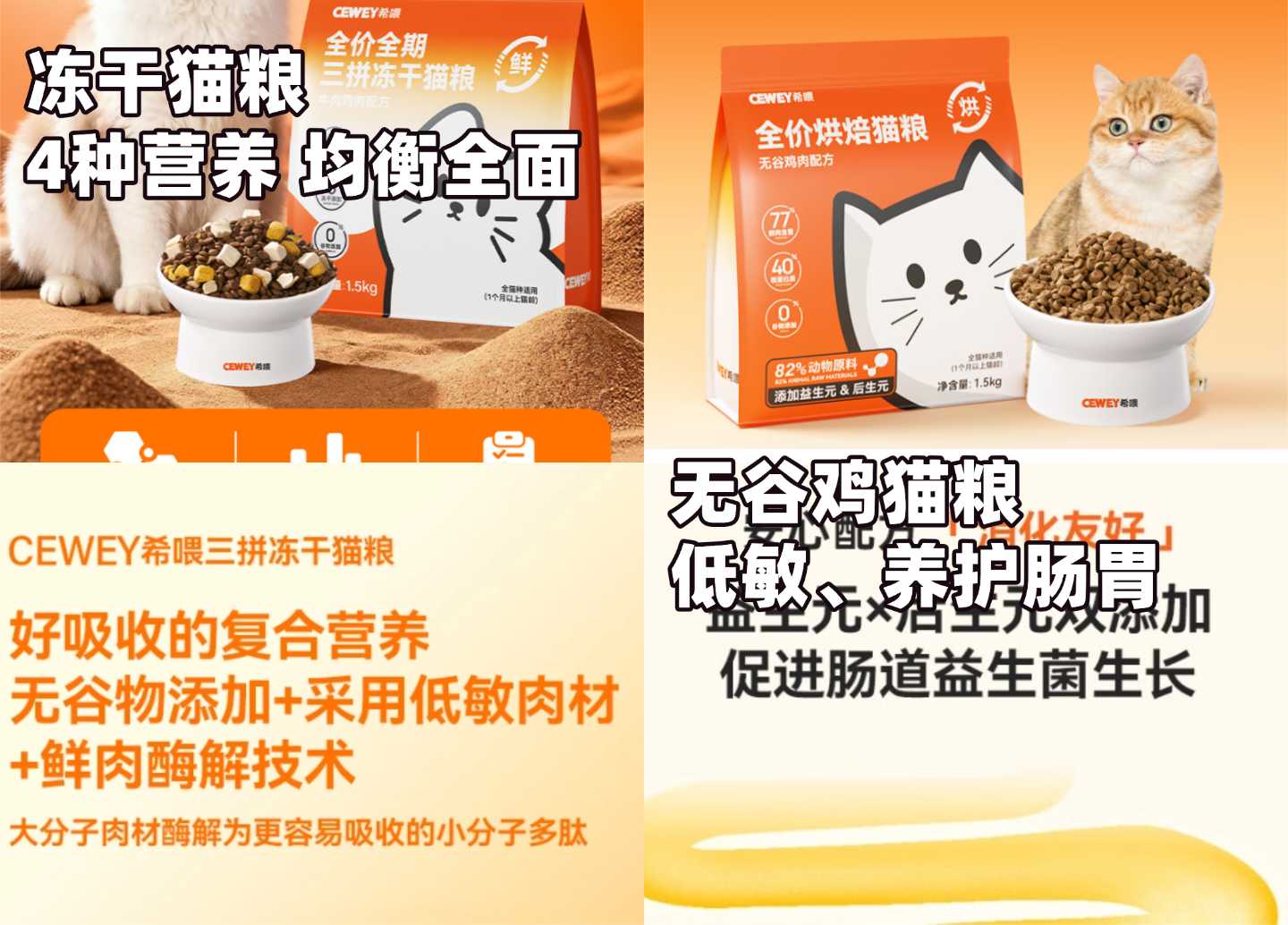 以上两款猫粮均为全价粮,适配从小猫到老年猫的全年龄段猫咪。若猫咪需要补充营养、增肥长肉,可选择三拼冻干猫粮;若猫咪肠胃格外敏感、易软便,则优先推荐无谷鸡烘焙猫粮。