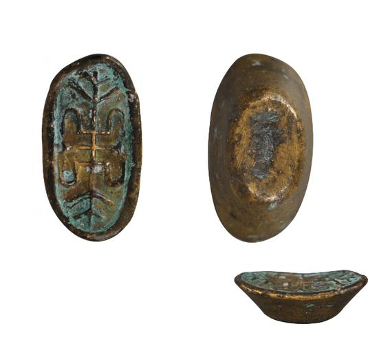 战国:郢爰(金版),龟背甲形状,表面有戳印