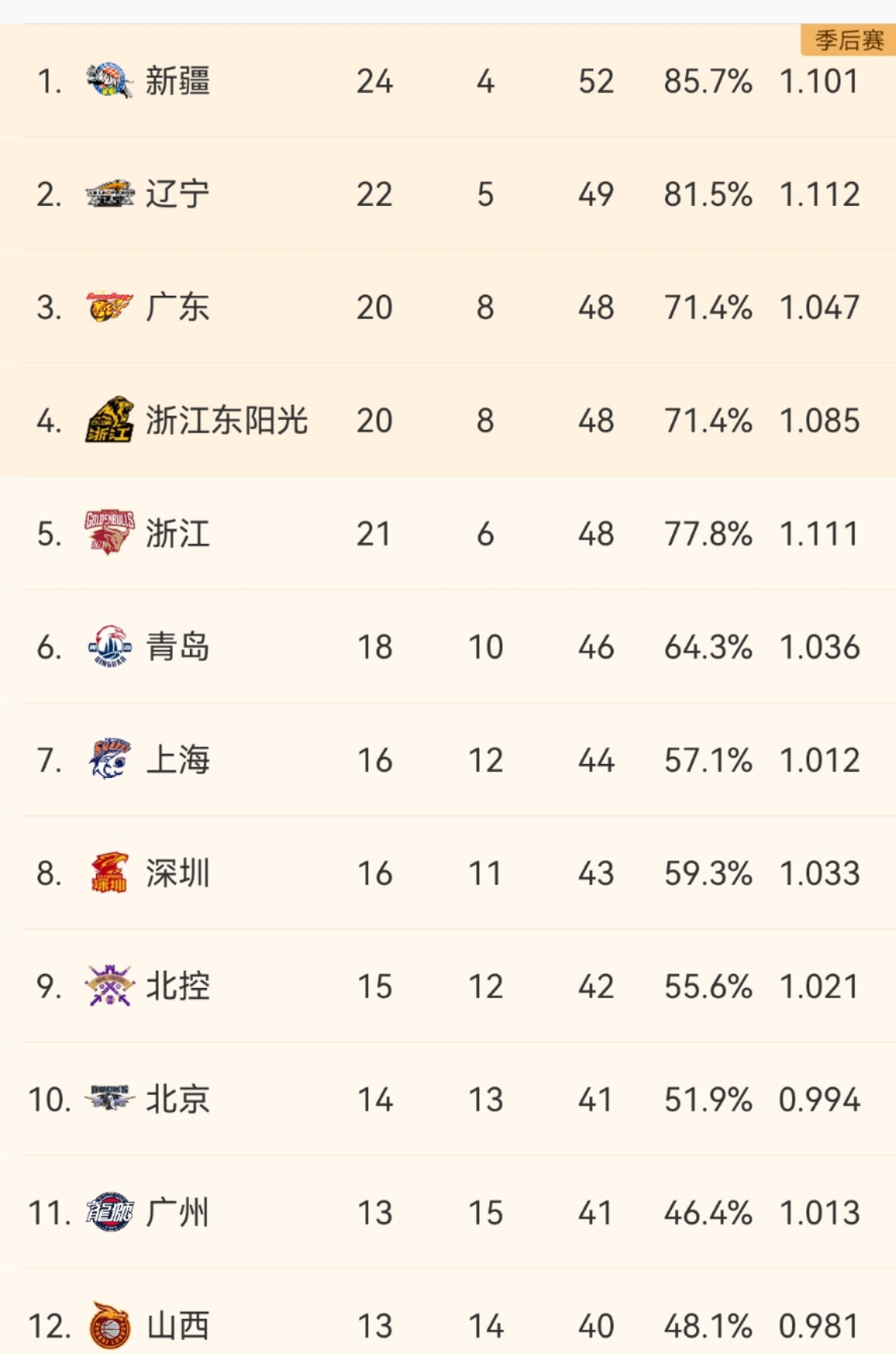 排名第六,青岛男篮战绩18胜10负,在刚刚结束的一场焦点战以上球队兵不血刃击败了江苏队,让自己的排名再次提升。在本场比赛当中,国内球员杨瀚森的状态十分糟糕,仅仅砍下2分8篮板,特别是在进攻端,没有太多充满威胁性的表现。然而即便如此,球队还有其他的人能够站出来,特别是两位外援鲍威尔和穆迪以高效率砍下了高分。这个赛季青岛男篮化身一匹黑马,期待他们能在季后赛上给我们带来更多的精彩表现。