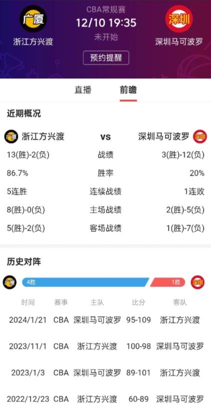 今晚19:30,CCTV5+会转播2024/2025赛季CBA第16轮的比赛,浙江方兴渡对阵深圳马可波罗。现在深圳的战绩是3胜12负,排名第17,已经遭遇一连败;而广厦则是13胜2负,排名第一,正处于5连胜状态。