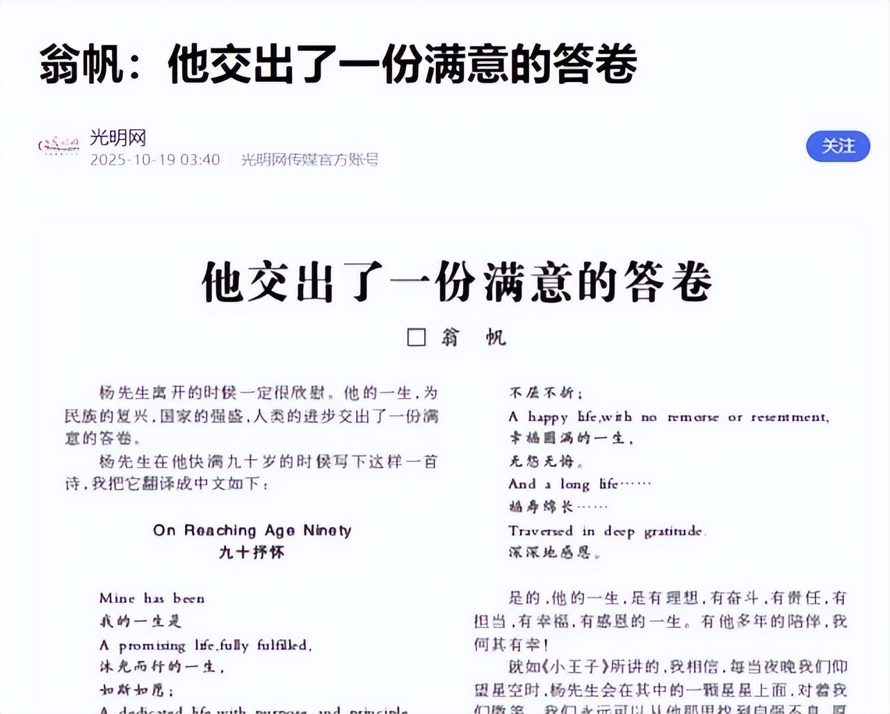 但他们的婚姻维持了21年,直到杨先生离世。翁帆在清华大学官网发了简短公开信,说“与先生相伴二十一年,何其有幸”,然后就没了动静,两个月不露面,不接受采访。
