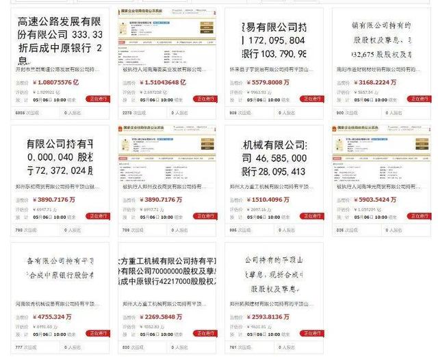 股价持续低迷,中原银行股权也被频繁拍卖。阿里资产网显示,中原银行合计有11笔股权正在被拍卖。