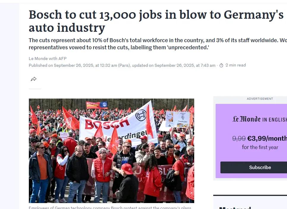 最后,全球产业链的动荡,进一步放大了利润压力。地缘政治冲突、原材料价格波动以及汇率风险,让博世的全球供应链持续承压。尤其是欧洲能源成本高企、中国市场竞争加剧,使得其生产与运营成本不断攀升。与此同时,全球车市需求疲软,车企纷纷压减零部件采购价格,进一步压缩了博世的利润空间。