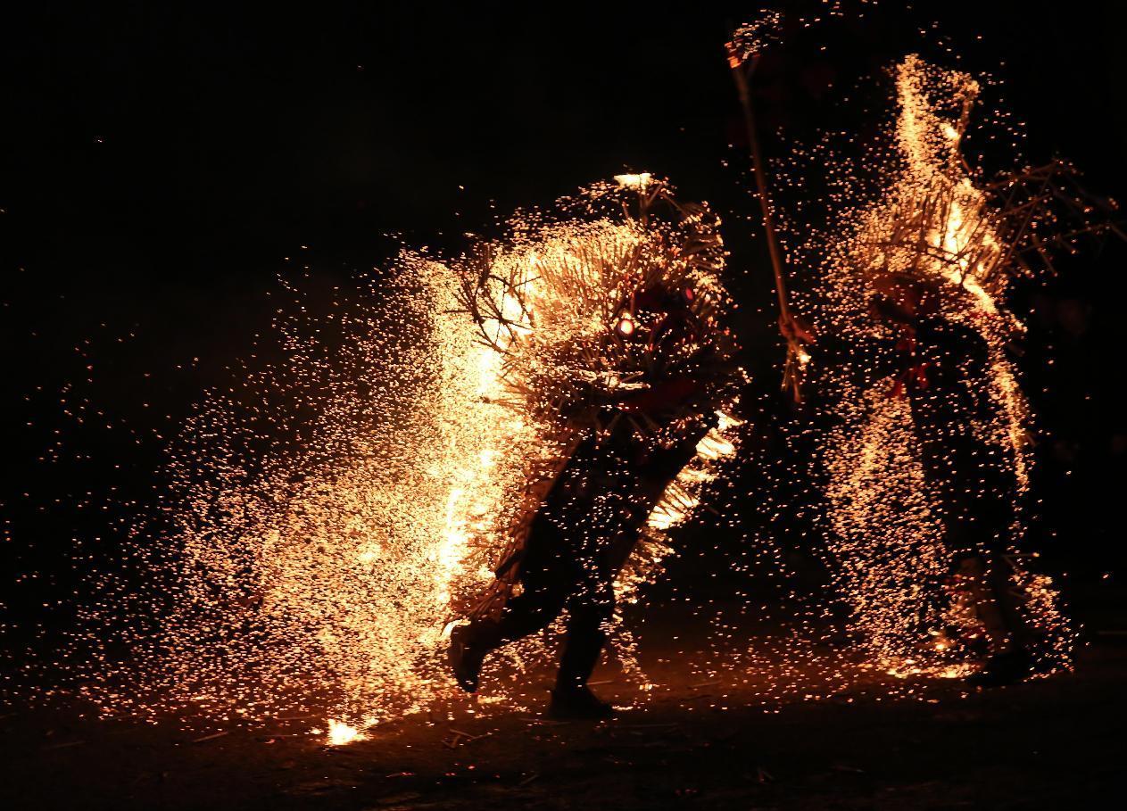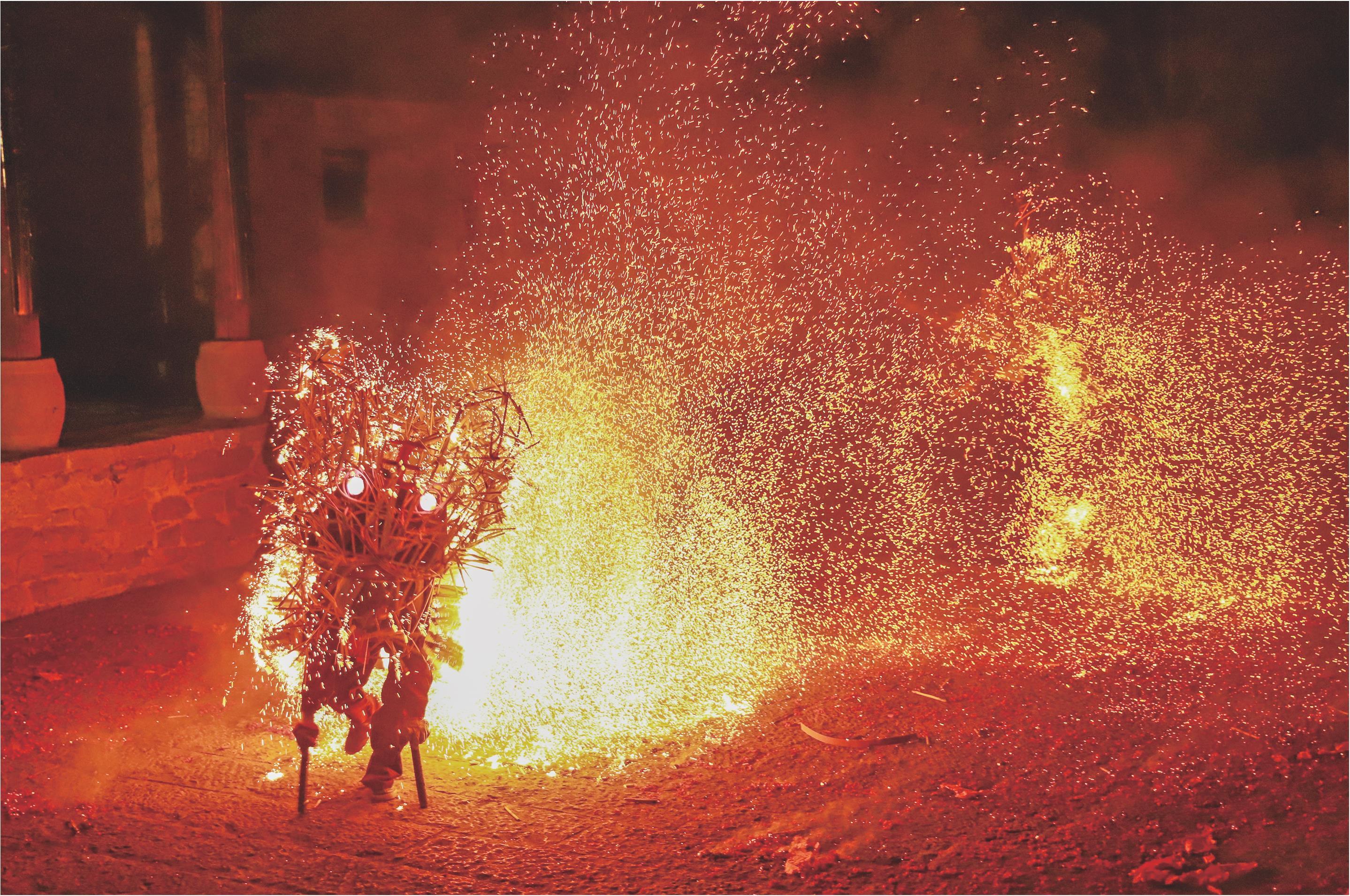 火虎衣的制作分为三个部分,虎身,虎尾,整套行头重达25公斤,表演者需踩着高跷完成腾跃、扑闪等动作,对体力与胆识的考验堪称极致。与之对峙的“打虎人”同样身披插满礼花筋的木甲,手持180厘米长的火棒,在锣鼓声中与火虎展开惊心动魄的搏斗。整个表演分为三个部分,出山、搏斗、收势,礼花筋燃尽,火虎“倒地”,火虎的魅力,不仅在于其视觉冲击力,更在于它所承载的中华民族勇猛果敢、积极向上的精神风貌,是邹鲁地区民众“昂扬刚健、不畏强暴”的性格特质。