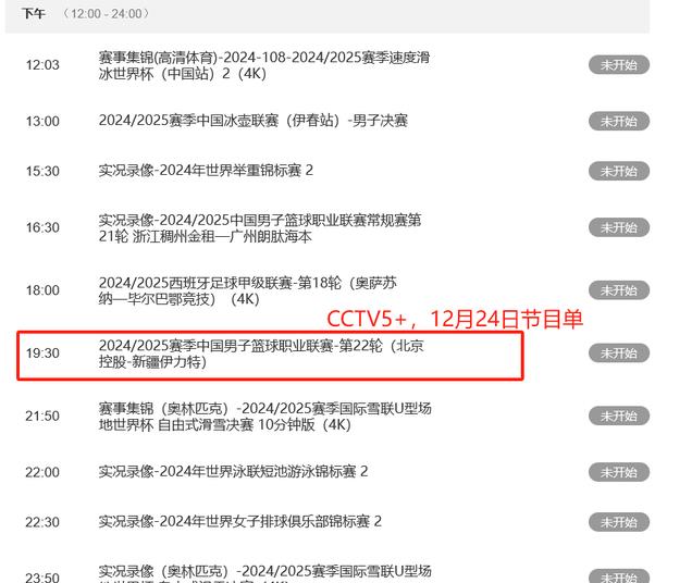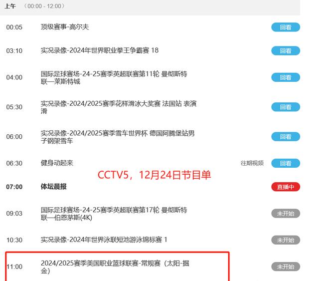 北京时间12月24日,女排世俱杯结束后,还有其他精彩赛事,包括NBA、CBA等篮球比赛。中央5台在12月24日的直播表已经出炉,下面我们一起来看看。
