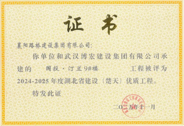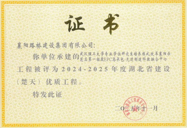 获评湖北省建设(楚天)优质工程,既是沉甸甸的行业认可,也是砥砺前行的新起点。展望未来,襄阳路桥将始终秉承“铸就精品工程”的初心,以技术创新为驱动、以品质提升为核心、以精细管理为支撑,为助推建筑行业高质量发展、谱写中国式现代化湖北篇章贡献力量。