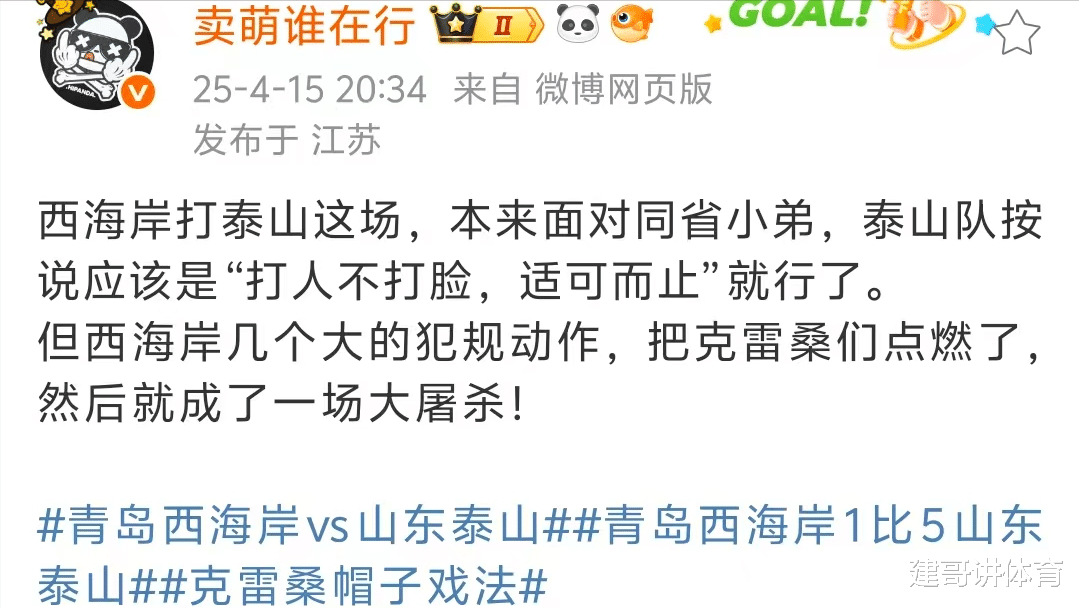 当克雷桑被青岛西海岸球员多次大动作犯规后,江苏媒体人“卖萌谁在行”为泰山队5-1狂胜西海岸做出了总结,他称泰山队踢同省小弟,按理说该适可而止就行了,但西海岸几次大的犯规动作,把克雷桑的情绪点燃了,然后就成了一场大屠杀。