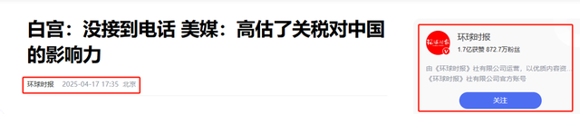 1.原文登载于环球时报2025年04月17日关于“白宫:没接到电话美媒:高估了关税对中国的影响力”的报道