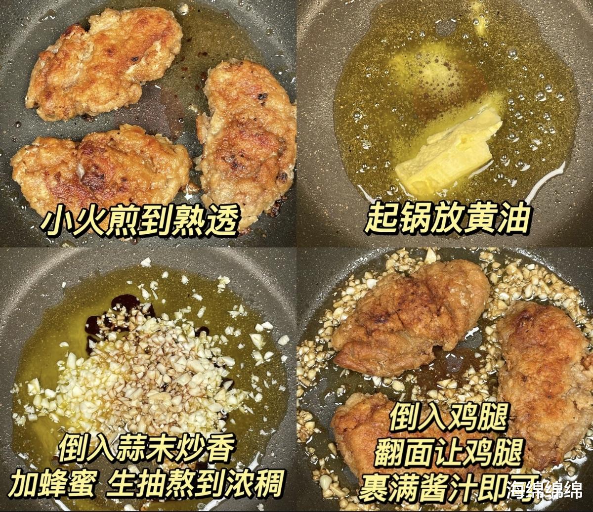 第五步,裹酱汁。把煎好的鸡腿肉倒入锅中,和蒜香黄油酱一起翻炒,让每一块鸡腿肉都裹满酱汁。翻炒的时候要轻一点,别把鸡腿肉炒碎了。酱汁浓稠后,关火,盛出。这时候,鸡腿肉外酥里嫩,裹着晶莹的蜂蜜糖霜,蒜香和黄油的香气扑鼻,光是看着就让人食欲大开。