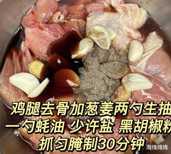 第一步,处理鸡腿肉。把鸡腿去骨,切成大小均匀的块状,不要太厚,否则煎的时候容易外焦里生。切好的鸡腿肉放入碗中,加入两勺生抽、一勺蚝油、少许盐、黑胡椒粉、葱姜,抓匀腌制30分钟。生抽提鲜,蚝油增香,盐和黑胡椒粉则让肉更有味道,葱姜能去腥。腌制的时间别偷懒,这是鸡腿肉“嫩滑”的关键。