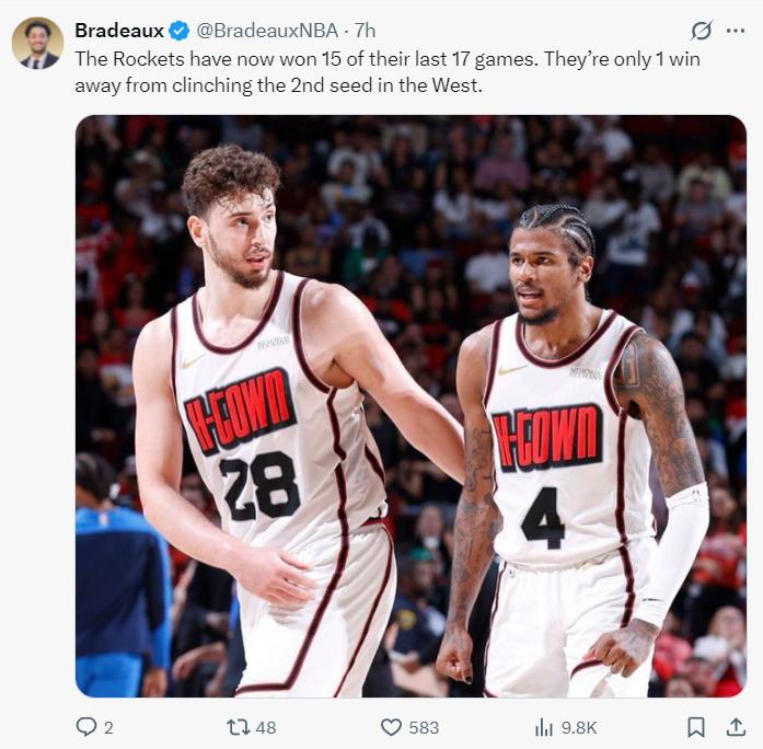 这是属于休斯顿火箭球迷的一天,自19-20赛季后我们就失去了呼吸的权利,你们知道这五年我怎么过的吗?24-25赛季我们不仅重返季后赛,还已经锁定了西部上半区的席位,北京时间4月7日,火箭还六喜临门。