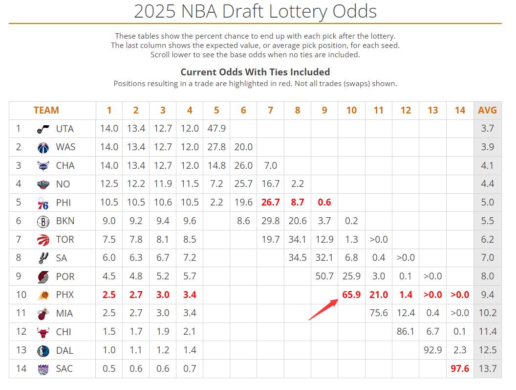 第四喜菲尼克斯太阳又输球了,太阳目前战绩35胜43负跟热火持平排在联盟第十,太阳第十号签的概率已经提升到65.9%,状元签概率2.5%,榜眼签概率2.7%,探花签概率3%,四号签概率3.4%。