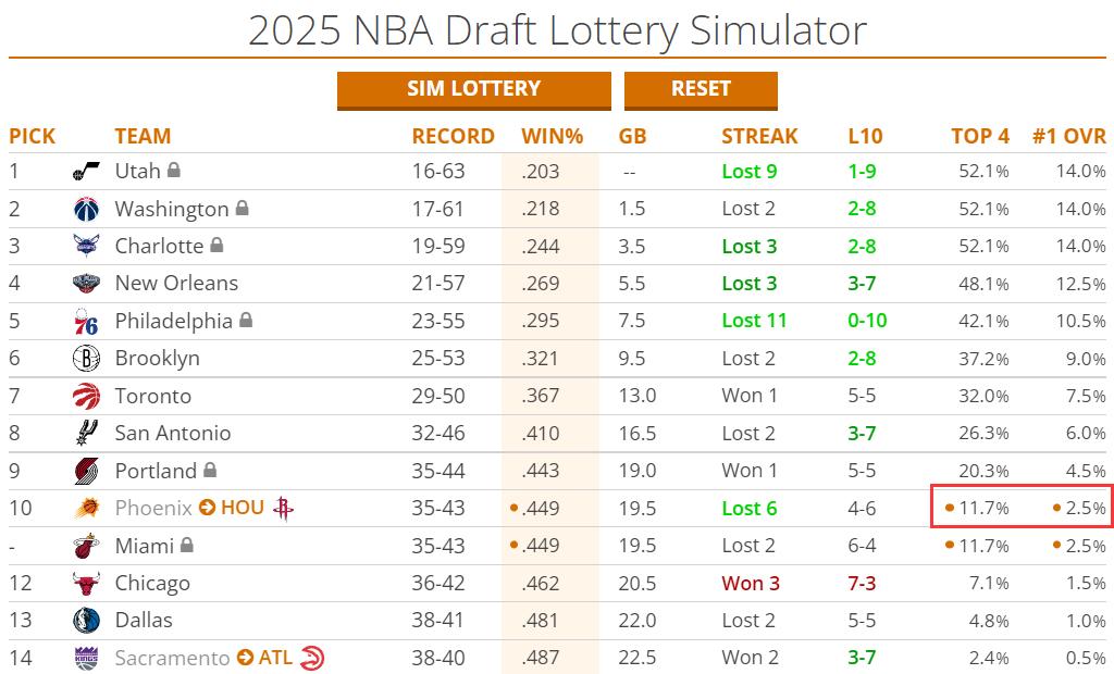 太阳前四签的概率都有11.7%,众所周知火箭可以换太阳这个首轮签,一旦太阳抽中状元签,那么我火就很不好意思了,前四签也可以,毕竟阿门就是第四顺位。