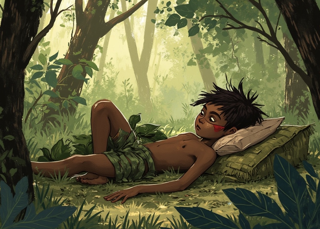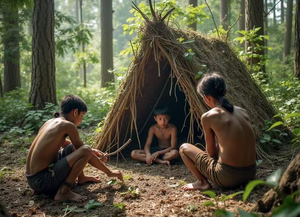 少年们会运用森林里的树叶、植被、树根等天然材料,在较为平坦的地方;或者于有利的地形之中,搭建起简易的庇护所,以此来遮挡雨水与阳光,给予基本的保护。