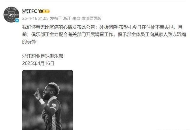俱乐部随后发布声明,对布彭扎的离世表示哀悼,并承诺配合警方调查,但未透露更多细节。
