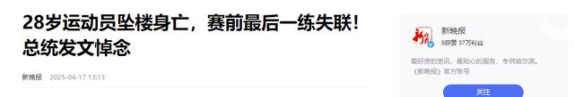 信息来源:新晚报 2025-04-17 28岁运动员坠楼身亡,赛前最后一练失联!总统发文悼念