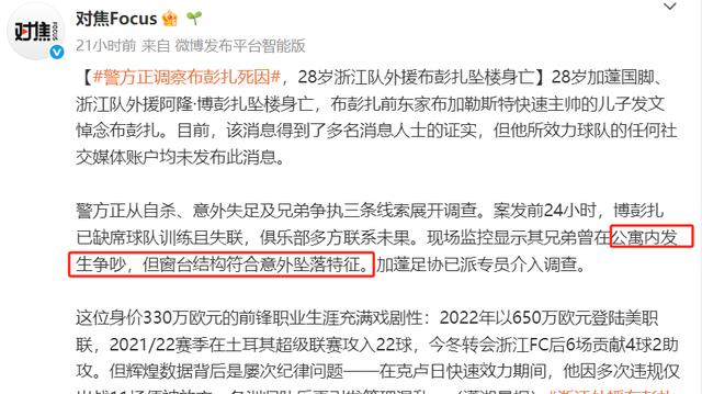 原来在比赛开场前,有人发现布彭扎从自家11楼的阳台坠落,经送医抢救无效身亡。