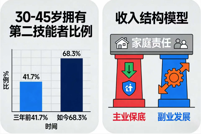 二、主业保底,副业发展:新职业生存策略在这种环境下,“主业保底,副业发展”正在从个人选择转变为群体性生存策略。根据2025年的一项职场调研显示:在30-45岁职场人中,拥有或正在发展第二技能的比例已达到68.3%,而这一比例在三年前仅为41.7%。