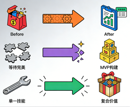 转变二:从“完美准备”到“最小可行”不要等到“完全准备好”再开始。学习中期就可以服务亲友,用真实反馈驱动技术改进。在美业领域,70%的技术提升发生在真实服务场景中,而非练习室。
