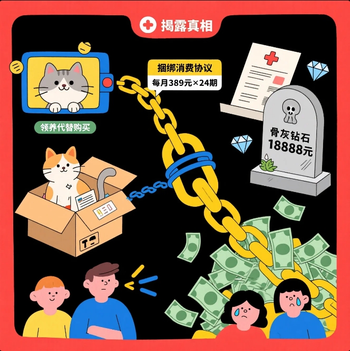 江苏动物保护组织调查发现,某平台“免费领养”的猫咪中,超60%携带猫瘟、猫传腹等致命疾病。消费者接到病宠后,商家再推荐“合作医院”收取高额治疗费,若宠物死亡则兜售数千元的宠物墓地或“骨灰钻石”,榨干最后一滴血。