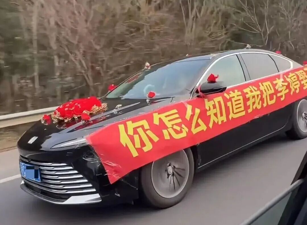 春运的高速车流如织,归心似箭的人们在岁末的寒风中奔赴团圆。就在这浩浩荡荡的迁徙大潮里,一辆黑色别克轿车格外醒目:车身上的红绸随风轻扬,副驾一侧的横幅红底黄字,像一句藏不住的告白,灼灼地亮在冬日天光里 ——“你怎么知道我把李婷娶到了?”