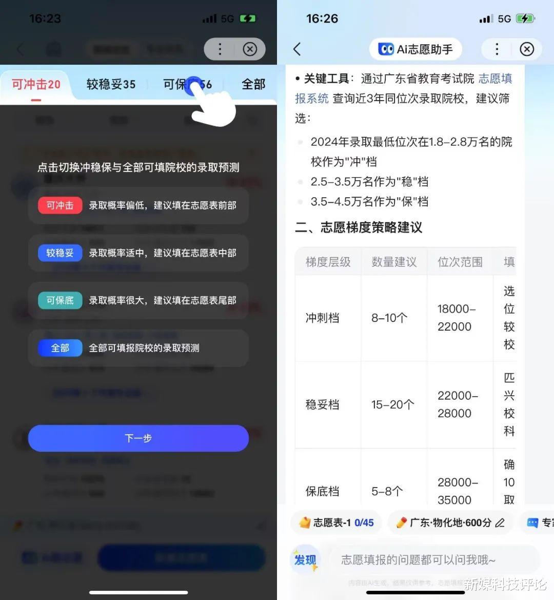不过,也有用户反映将同一考生背景和成绩输入不同AI志愿填报产品后,得出的结果却完全不同。业内人士指出,不同产品背后的算法逻辑和训练数据都不同,比如百度“AI志愿助手”提到参考了广东省教育考试院近三年的数据内容,也有部分产品只参考了近一两年的录取数据,有差异是必然的。