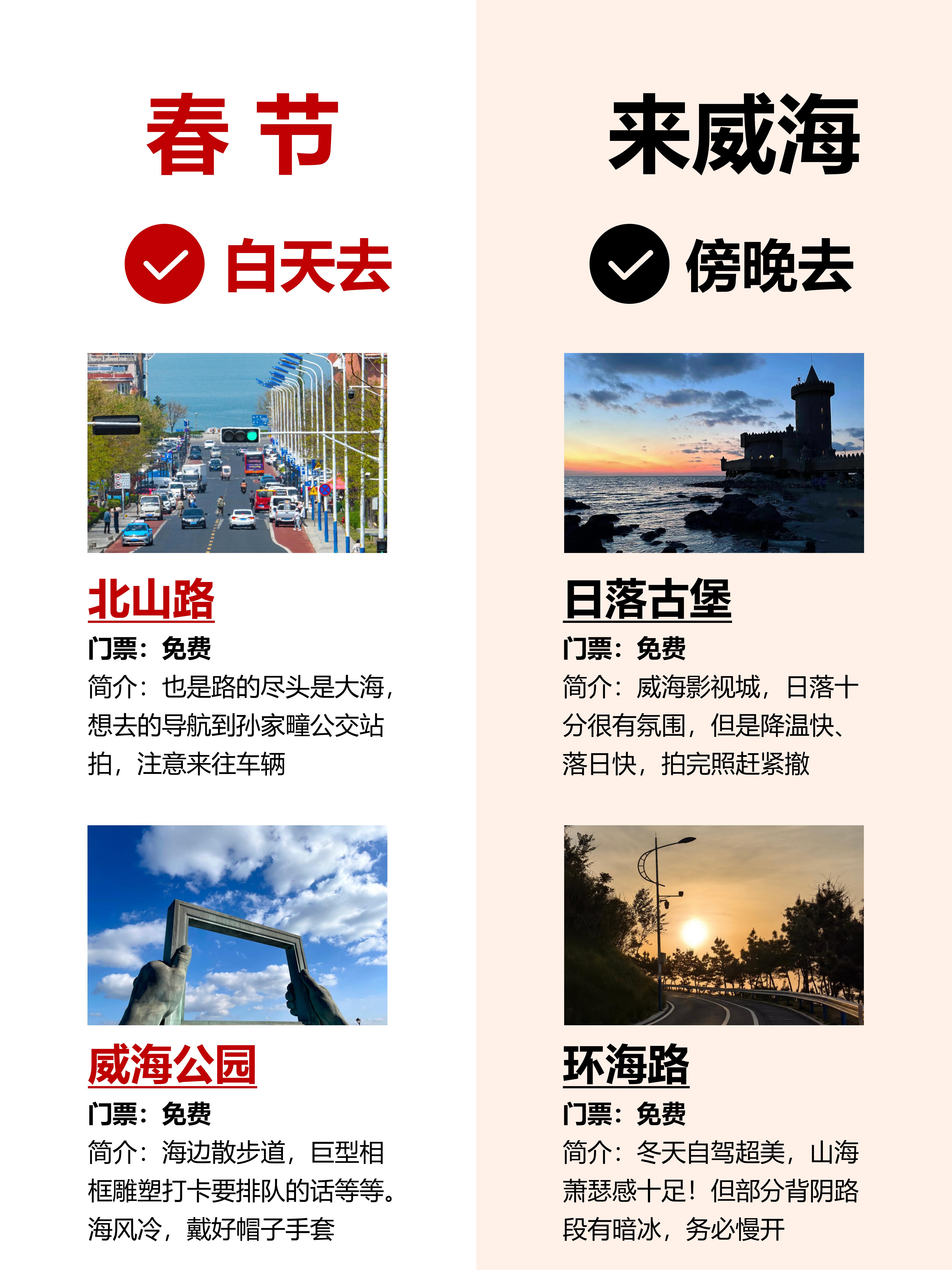 1) 关于交通:冬天环海观光巴士班次少,务必提前电话确认是否运营!更推荐自驾或打车。去荣成线强烈建议包车,天冷等车太煎熬